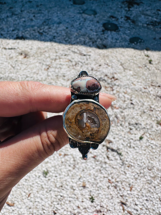 Boho Sterling Silver Statement Ring with Fossilized Druzy & Mexican Opal – Size 7