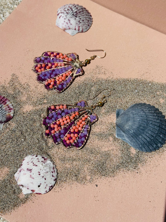 Beaded Ruby and Coral Sea Shell Earrings