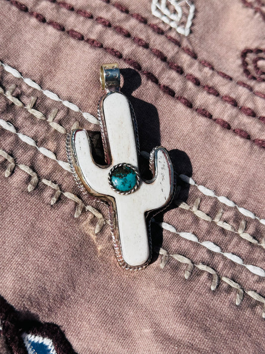 Buffalo Bone and Turquoise Cactus Pendant